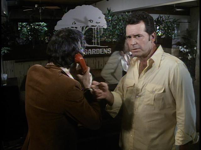 In the above photo you can see the restaurant's name on the sign hanging off the top of the building and in the below photo you can see a part of the name "Gardens" along with the same tree logo on the wall behind Jim Rockford.